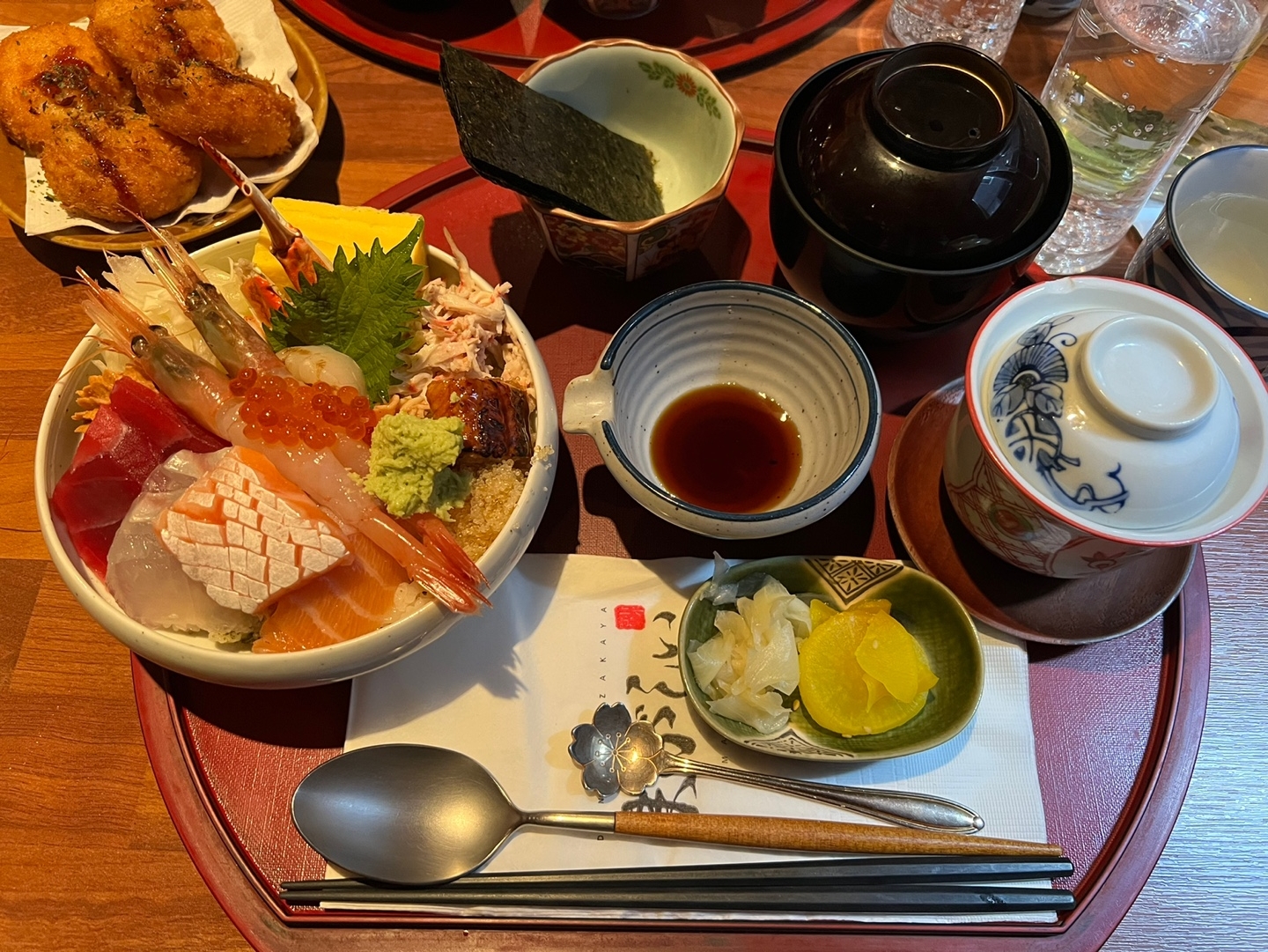 원근감 때문에 그럴듯해 보이지만 밥 위에 올려진 회 양이 상당했다. 바닥에 밥 한공기, 위에 생선회 한조각을 얹고 와사비와 간장을 뿌려 한입에 먹는다. 점심이나 저녁에 간단하게 먹기 좋은 메뉴입니다. 다만 가격이 만만치 않다.