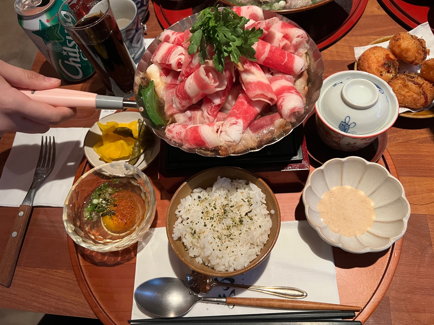 안양 평촌역에서 일식집을 찾는다면 모리코무에 카이센동과 스키야키가 있다. 스키야키의 경우 바닥에 미니 화로와 고온 연료가 있어 작동하고 고체 연료에 불을 붙입니다.