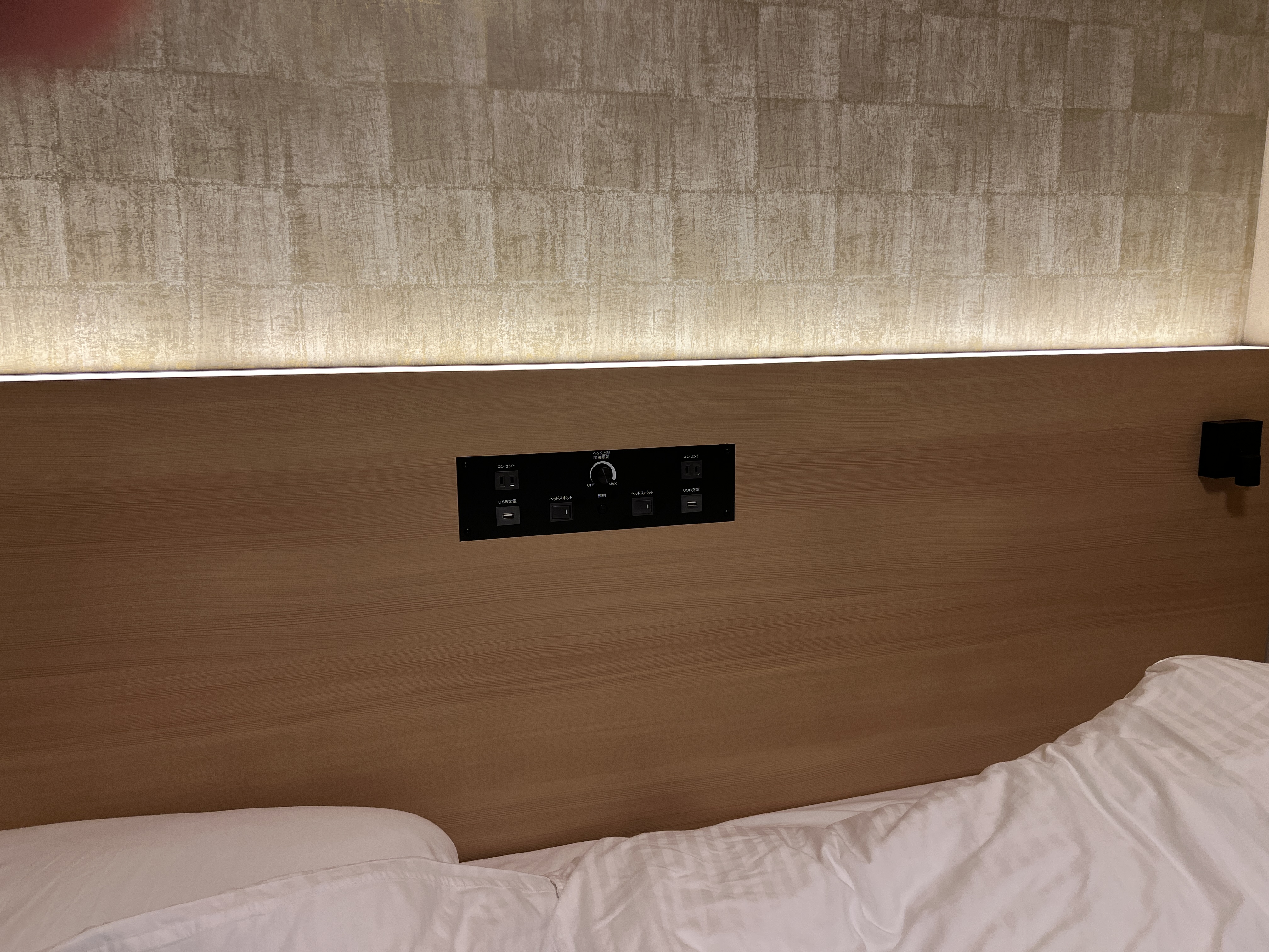 방의 크기가 크고 침대 옆 소파에서 1명이 더 잘 수 있을 것 같았기 때문에. 침대는 더블베드인데 푹신하지도 않고 딱딱한 느낌이라 저희에게 잘 맞았습니다. 침대는 시몬스 제품이어야 합니다. 침대 머리 부분에는 빛의 세기를 조절할 수 있는 스위치가 있는데, 중앙에 있는 동그란 버튼으로 조작할 수 있습니다.