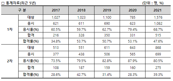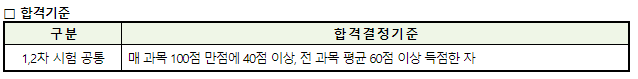 합격기준은 1차와 2차 공통으로 각 과목 100점 만점에 40점 이상, 전 과목 평균 60점 이상을 득점해야 합격한다.