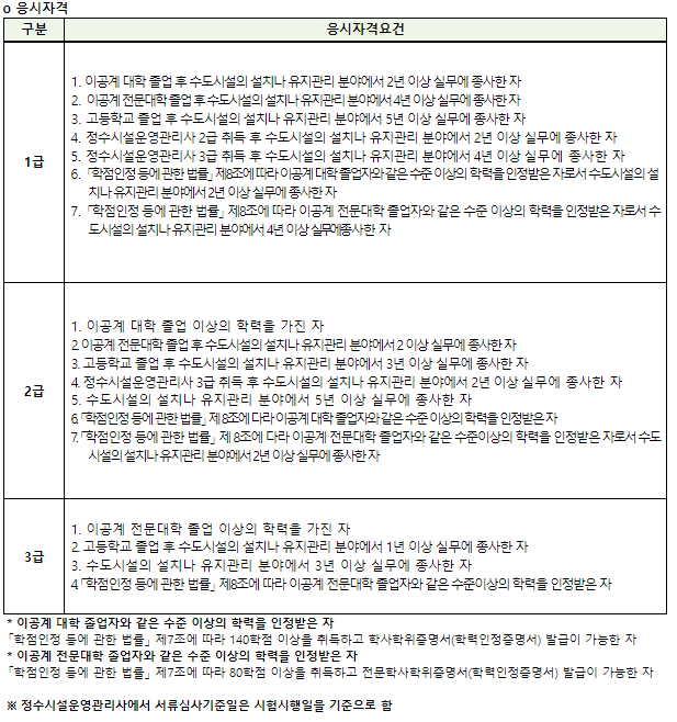 정수시설운영관리인은 2007년부터 시행된 자격제도입니다. 초창기에 비해 매년 지원자가 줄었지만 최근 다시 늘고 있습니다. 현재 관리자의 고령화가 시작되었고, 첨단 기술의 발달로 똑똑해지는 젊은 인력이 필요합니다. 정수시설관리사는 1급, 2급, 3급으로 구분되며, 각각의 자격요건이 있습니다. 아래 이미지를 확인하시고 본인의 자격에 맞게 시험을 준비하시기 바랍니다.