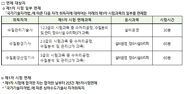 위 이미지는 정수장운영관리사 시험시 면제조건 및 면제과목에 대한 이미지 입니다. 지원자는 해당 내용을 확인하시고 참고하시기 바랍니다.