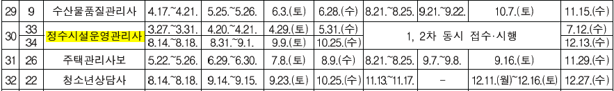 정수시설 운영관리자는 1차, 2차 심사를 동시에 받아 시행한다. 정기 원서 접수 기간은 3월 27~31일, 8월 14~18일이며, 공석 접수 기간은 4월 20~21일, 8월 31일~9월 1일입니다. 시험일은 4월 29일(토), 9월 9일(토)이며, 합격 지원자는 7월 12일과 12월 13일에 발표됩니다. 모든 지원자는 위 일정을 참고하여 기간 내에 지원하여 좋은 결과 있기를 바랍니다.