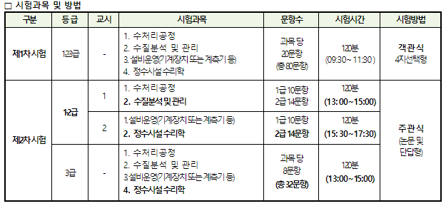 2차 시험의 경우 1교시와 2교시는 1교시와 2교시로 나누어진다. 1교시는 ‘수처리공정’과 ‘수질분석 및 관리’ 과목을 수강한다. 레벨 1에는 10개의 질문이 있고 레벨 2에는 14개의 질문이 있습니다. 2등급은 ‘시설운영(기계장치 또는 계측기기 등)’과 ‘정수시설의 유압장치’로 구성된다. 3단계는 ‘수처리공정’, ‘수질분석 및 관리’, ‘시설운영기계 또는 계장 등)’, ‘정수처리시설 수력학’으로 총 32문항(과목당 8문항)으로 구성되어 있다. . 시험은 주관식으로 논문과 주관식으로 구성되며 시험시간은 120분이다.
