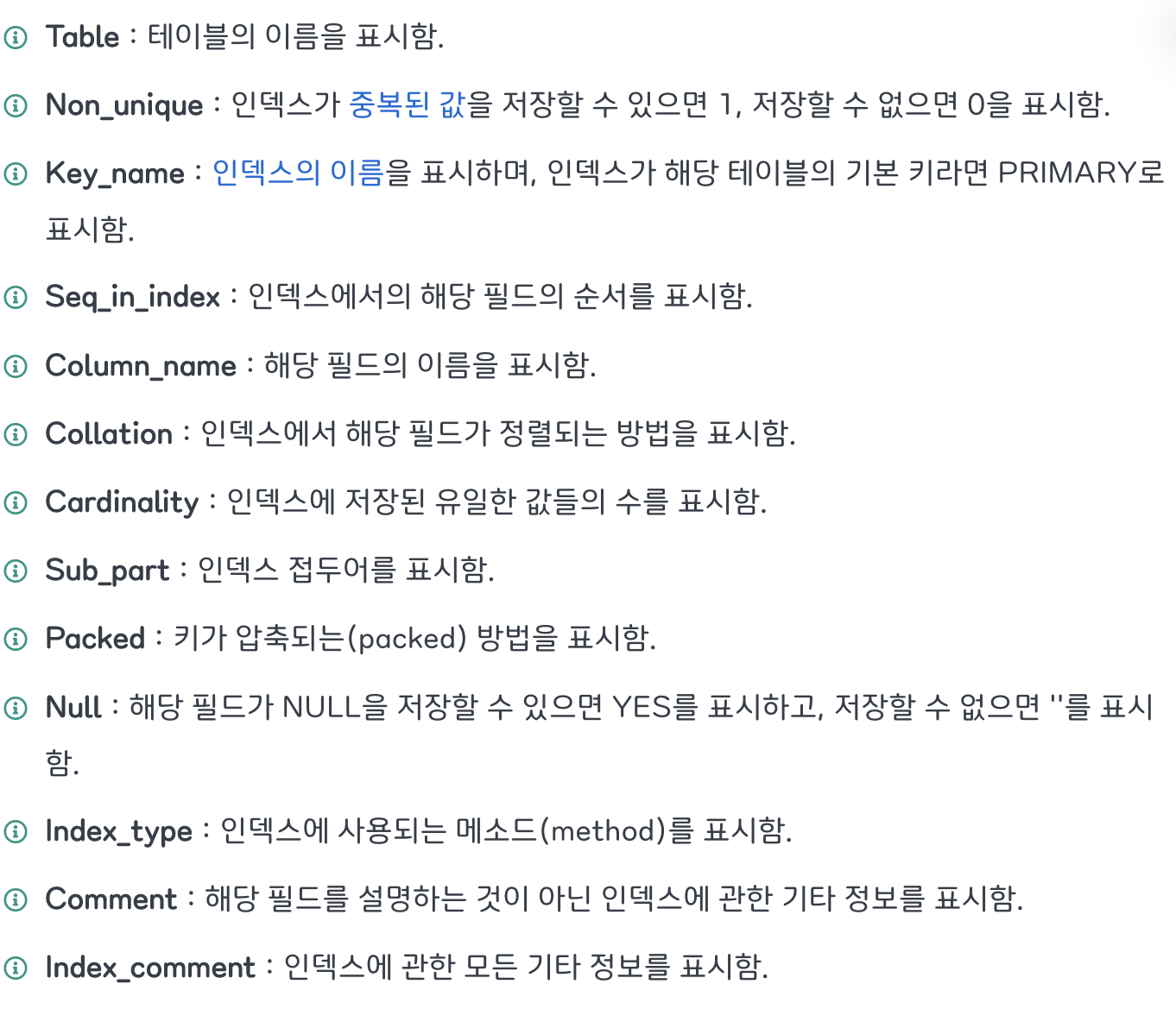 SHOW INDEX FROM '테이블명'